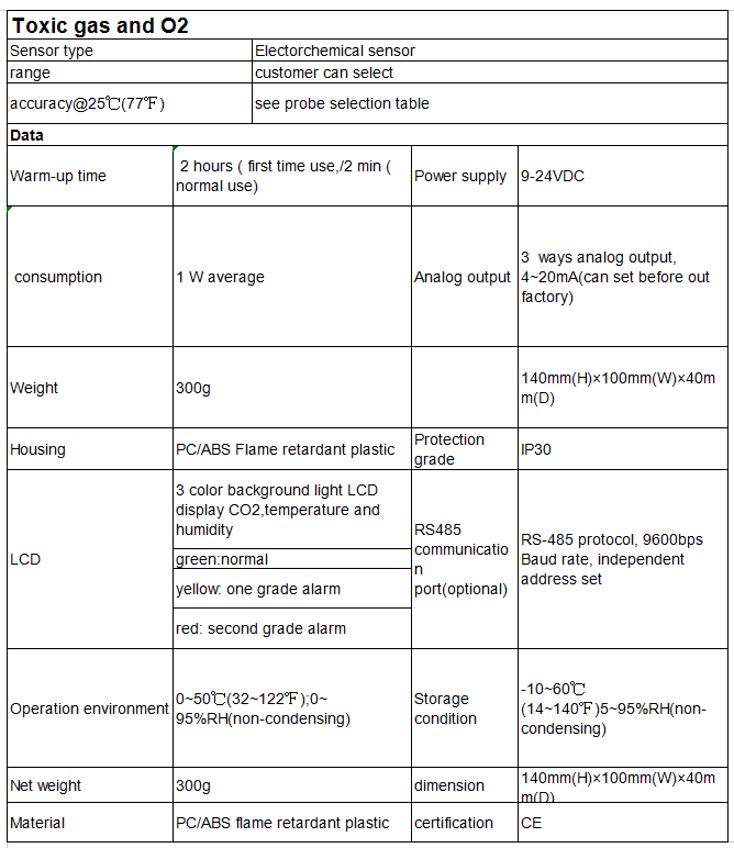 Toxic gases and oxygen monitoring controller based on customer specific needs, it has integrated style and separated style, sensors using the world the most advanced electrochemical gas sensor, the sensor portion using a high-precision AD low temperature drift and high stability power processing circuitry to protect the instrumentation fast, accurate measurement, stable and repeatable, designed for harsh and humid environments toxic gas and oxygen measurement under. Alarming instrument has an automatic function, providing customers with on-site security.